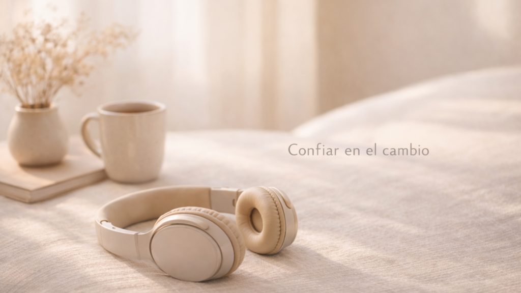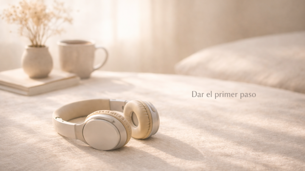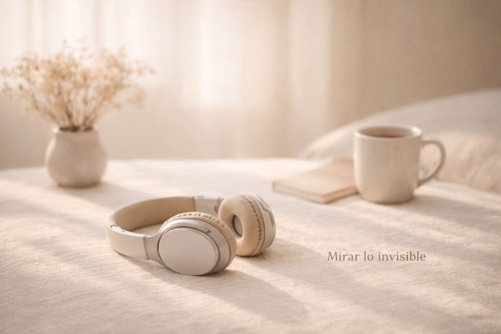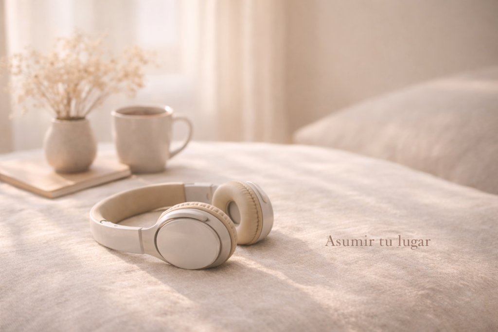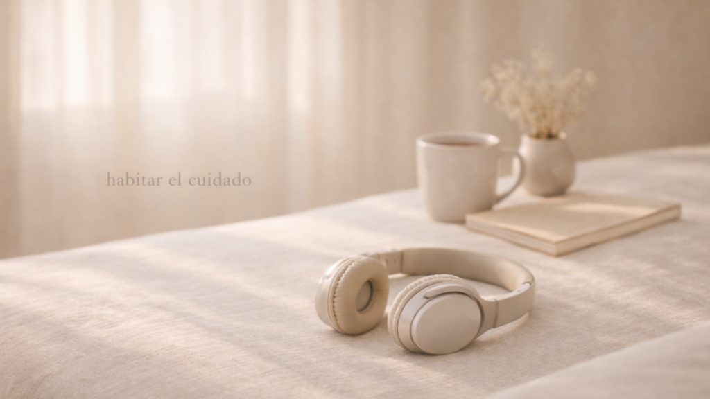 Auriculares beige apoyados sobre una superficie de lino en un interior cálido con luz natural suave; una taza de cerámica, un cuaderno y flores secas al fondo, transmitiendo calma, presencia y habitarse con honestidad.