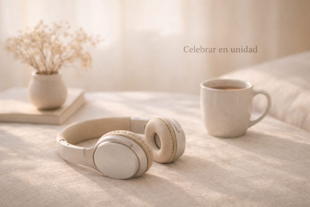 Auriculares beige apoyados sobre una superficie de lino en un interior cálido con luz natural suave; al fondo, una taza de cerámica, un cuaderno y flores secas, creando una atmósfera de calma y de volver a escucharse.