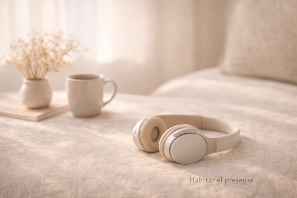 Auriculares beige apoyados sobre una superficie de lino en un interior cálido con luz natural suave; al fondo, una taza de cerámica, un cuaderno y flores secas, creando una atmósfera de calma y de aprender a notar.