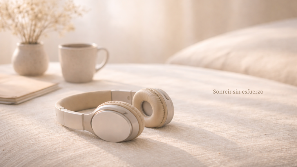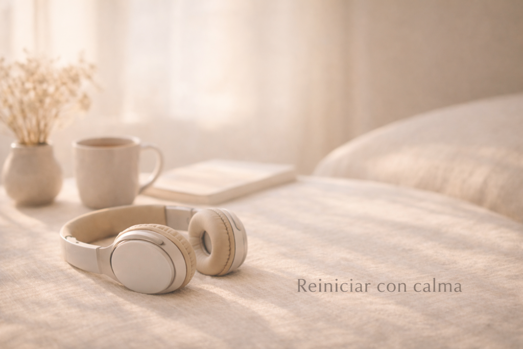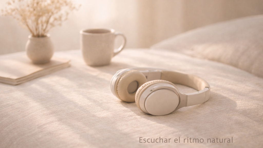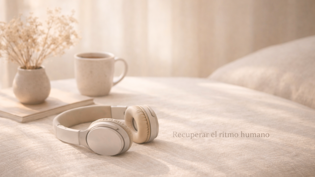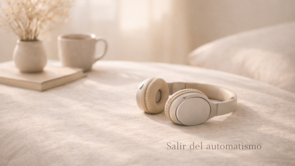 Auriculares beige reposando sobre una superficie de lino en un interior cálido con luz natural suave; una taza de cerámica con bebida caliente y flores secas al fondo, creando una atmósfera de pausa y salida del automático.