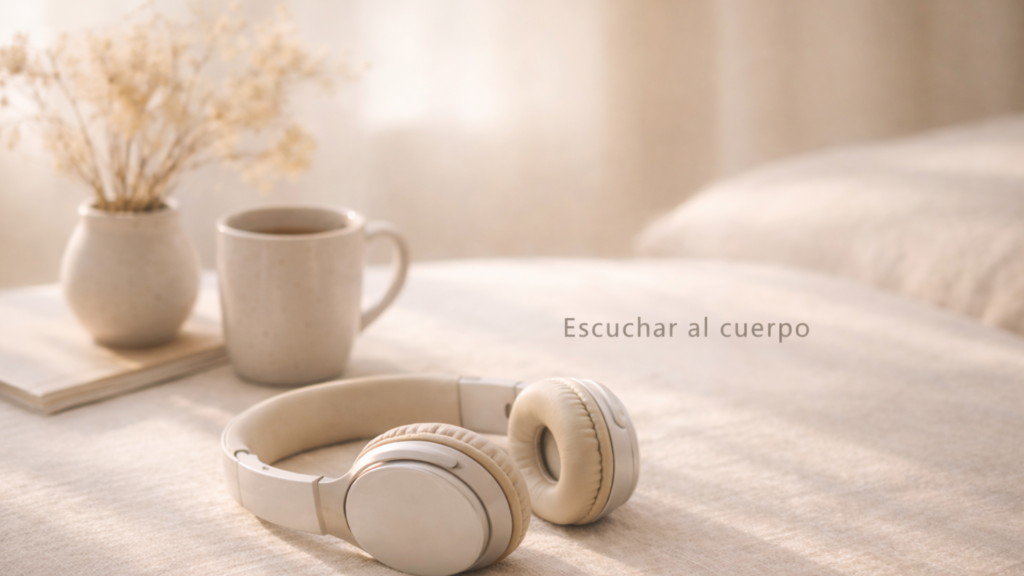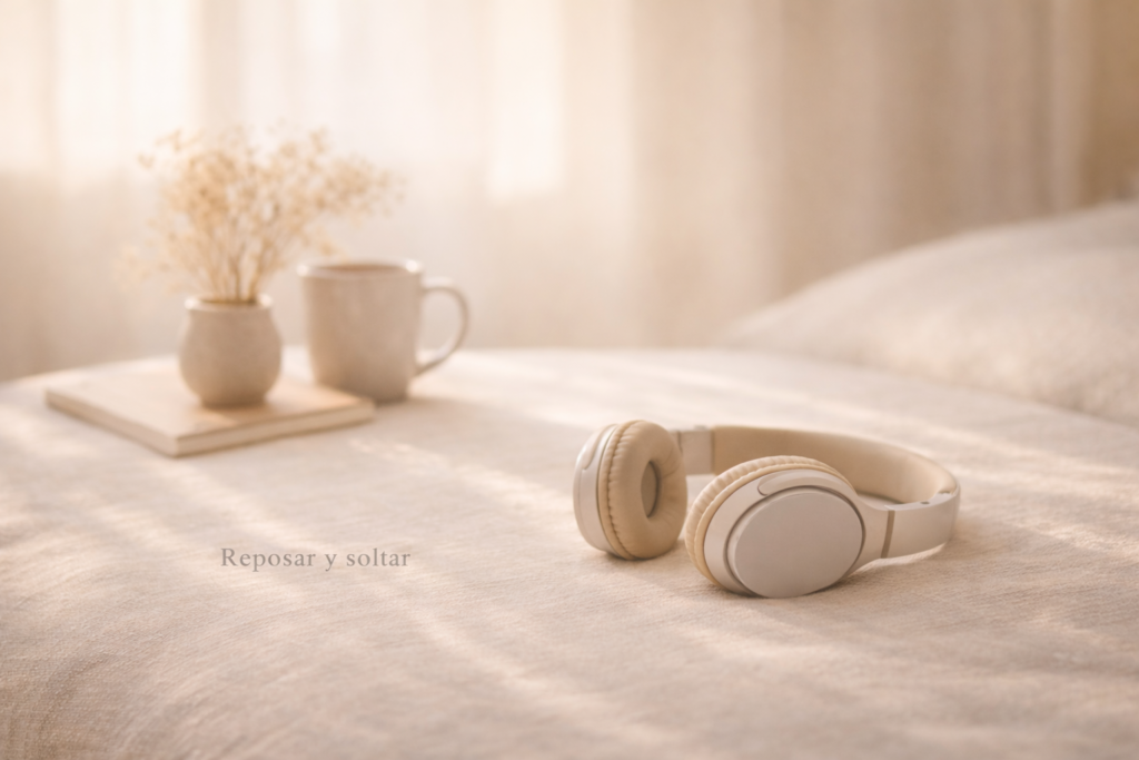 Auriculares beige reposando sobre una superficie de lino en un interior cálido con luz natural suave; al fondo, una taza de cerámica y flores secas, creando una atmósfera de pausa y de devolver espacio al cuerpo.