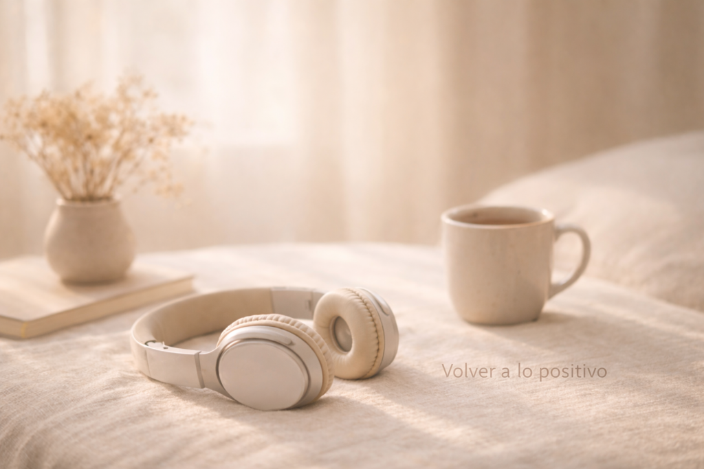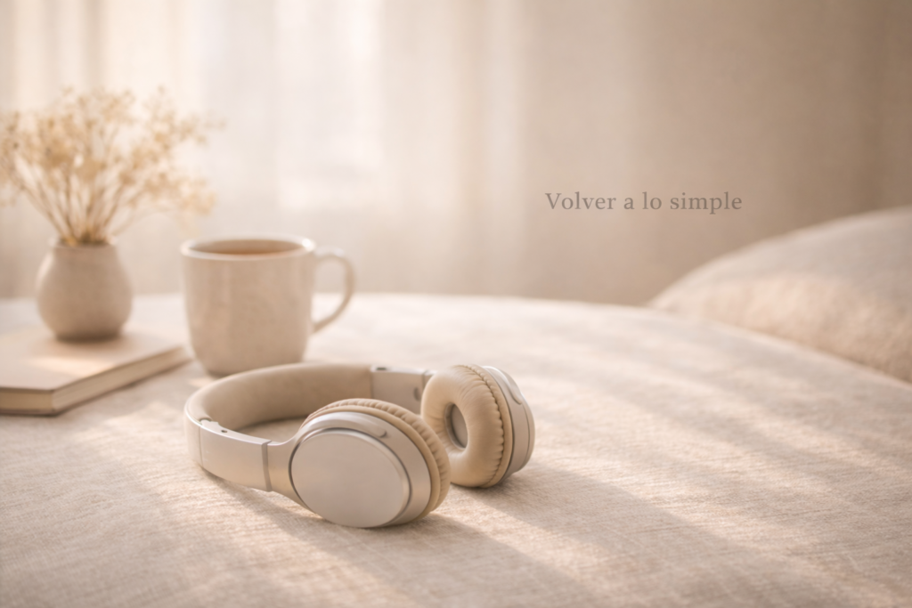 Auriculares beige apoyados sobre una superficie de lino en un interior cálido con luz natural suave; al fondo, una taza de cerámica y flores secas, transmitiendo calma y regreso al centro.
